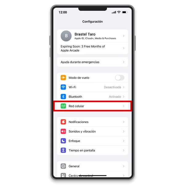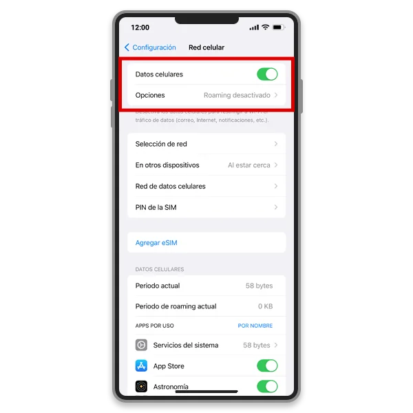 3. Activa[Datos celulares]. En[Opciones], desactiva[Roaming de datos].