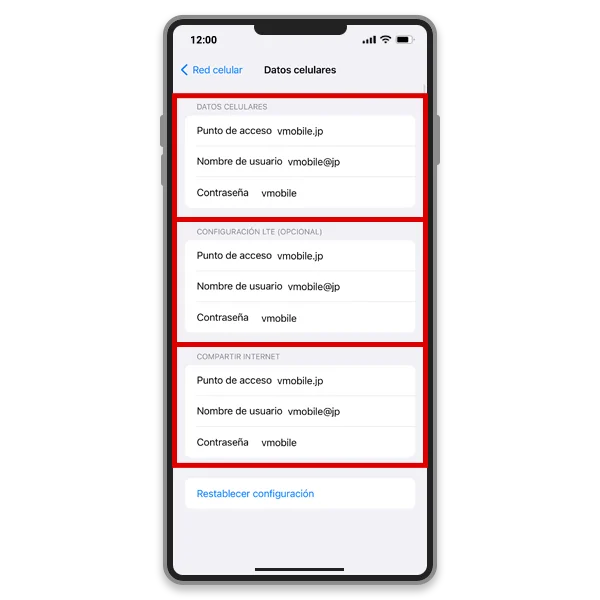 Contraseña: vmobile* El procedimiento de configuración y los nombres de las configuraciones pueden variar según el sistema operativo y/o la versión del sistema operativo de su dispositivo.