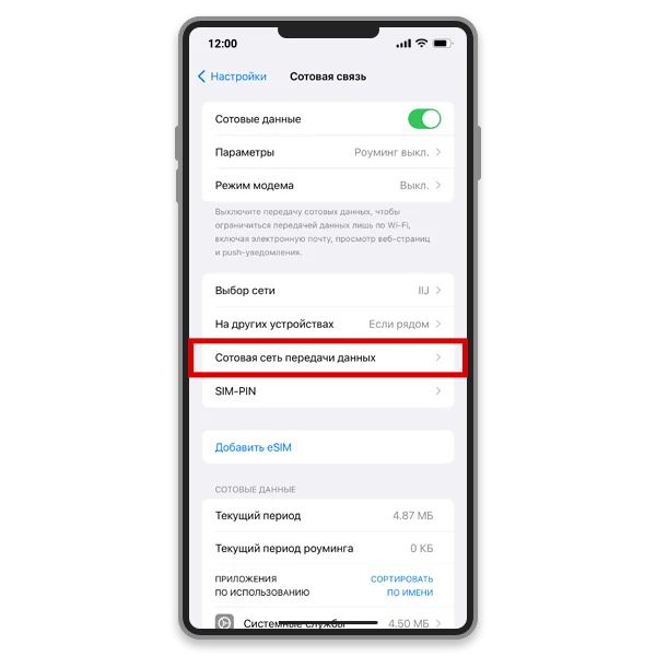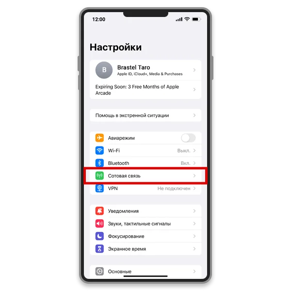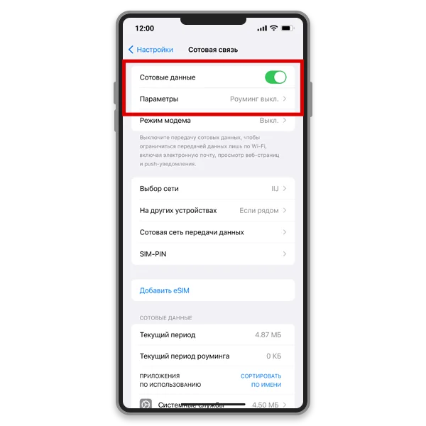 3. Установите [Сотовые данные] на ВКЛ. В разделе [Параметры сотовой передачи данных] отключите [Роуминг данных].
