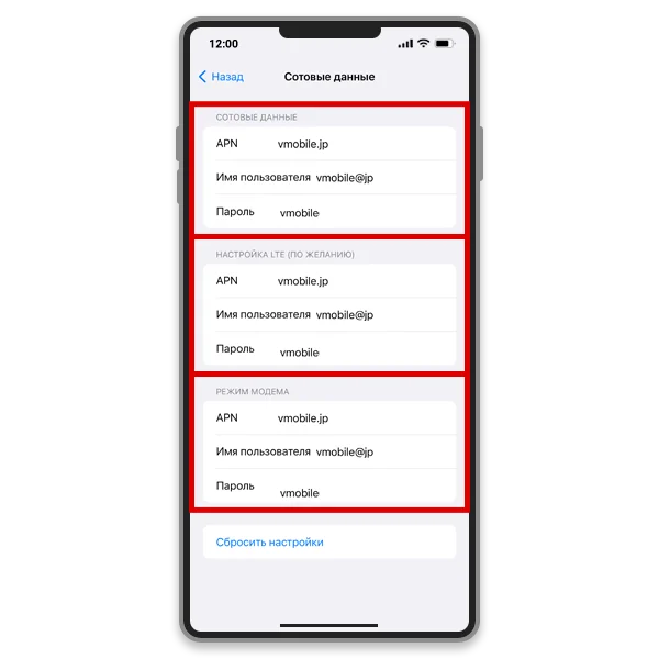 5. В разделах [Сотовые данные] и [Настройка LTE (по желанию)] введите настройки APN, как показано на изображении. Если вы хотите использовать раздачу интернета, также введите настройки в разделе [Режим модема].