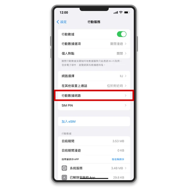 - 選項1:直接從 [行動服務] 或 [行動數據] 選單中,點選 [行動數據網路] 或 [行動網路數據]。