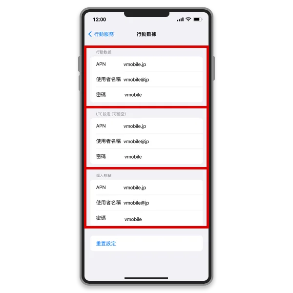 5. 在 [行動數據]和 [LTE 設定(選填)] 部分,輸入圖片中顯示的 APN 設定。如果要使用網路共享,請在 [個人熱點] 部分輸入設定。